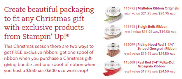 In the meantime, I thought I’d let you know about the new ribbon promotion that Stampin’ Up! is offering between now and the end of November. Us Demonstrators only found out about this one yesterday, so we are all just as excited as everyone else! I’m not sure what I’m more excited about – new ribbons I haven’t had before, or the Christmas Cocoa DSP which I can’t wait to lay my hands on!